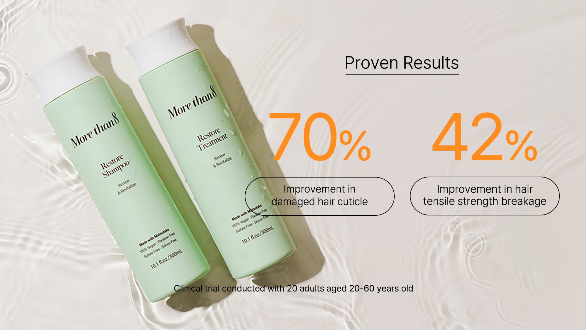 Before product use, 2.7 Grade > 0.9 Grade after 2 weeks of use and the Maximum improvement in hair tensile strength breakage 42%